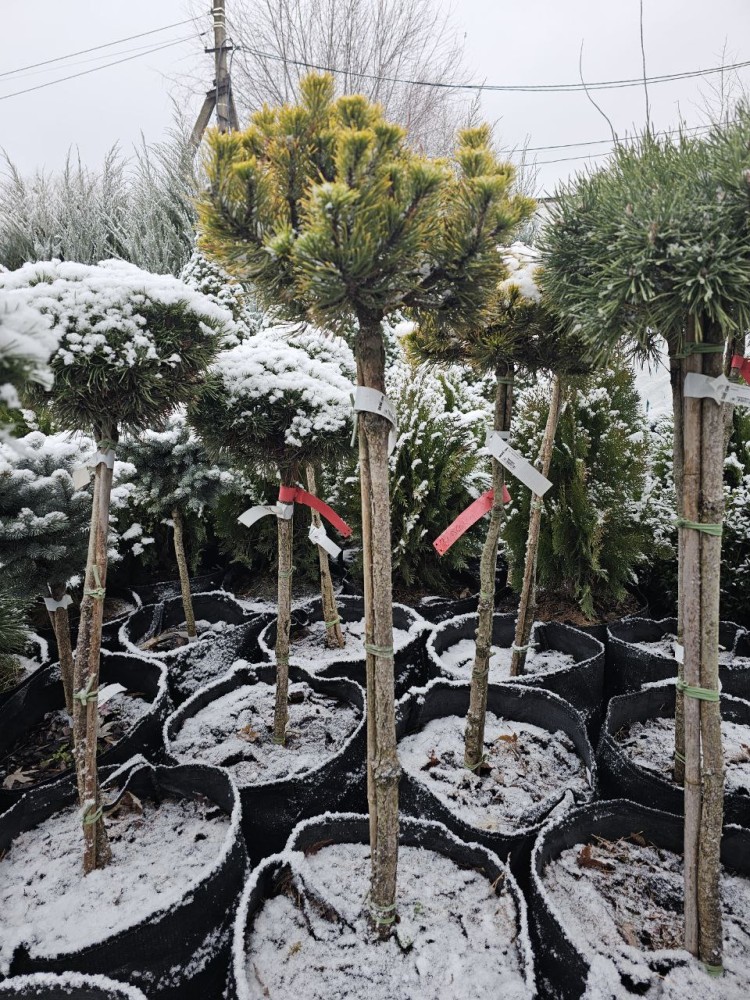 Догляд взимку: з кінця лютого до кінця березня в сонячні дні необхідно вигрібати сніг з внутрішньої частини кулястих форм, або затінювати білими тінівками для того, щоб не допустити утворення крижаної / сніжної оптичної лінзи, яка за кілька сонячних днів може випалити внутрішню частину крони подушкоподібних хвойників. Якщо лід закріпився у внутрішній частині кулі і не руйнується без пошкодження хвої - обсипте лінзу чорною землею або низинним чорним торфом - в перший сонячний день лід розтане без опіку рослини.