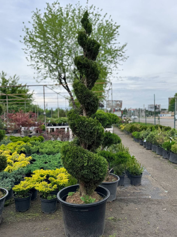 Туя Смарагд у формі спіралі — це елітний акцент у дизайні ділянки. Вона додає саду геометрії, структури й стилю. Ідеальний вибір для топіарних композицій, оформлення алеї, вхідної групи чи патио.